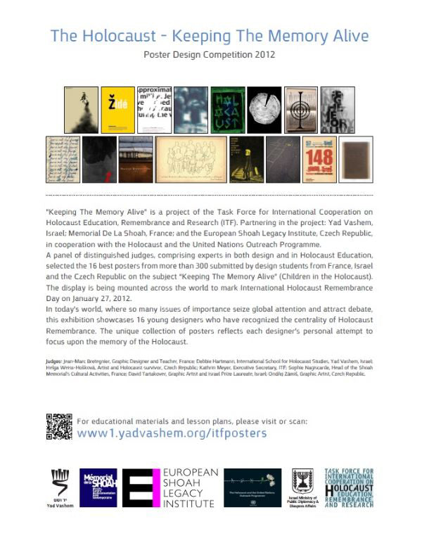 International Holocaust Memorial Poster Design Competition: The International Poster Competition is a joint project of Yad Vashem and the Holocaust and the United Nations Outreach Programme. It is also endorsed by the International Holocaust Remembrance Alliance – IHRA. Students of Art and Design are invited to submit original posters on the theme "Keeping The Memory Alive- Our Shared Responsibility” – the theme of International Holocaust Remembrance Day at the United Nations There are three sets: 2012 2013-2014 2017-2018.
