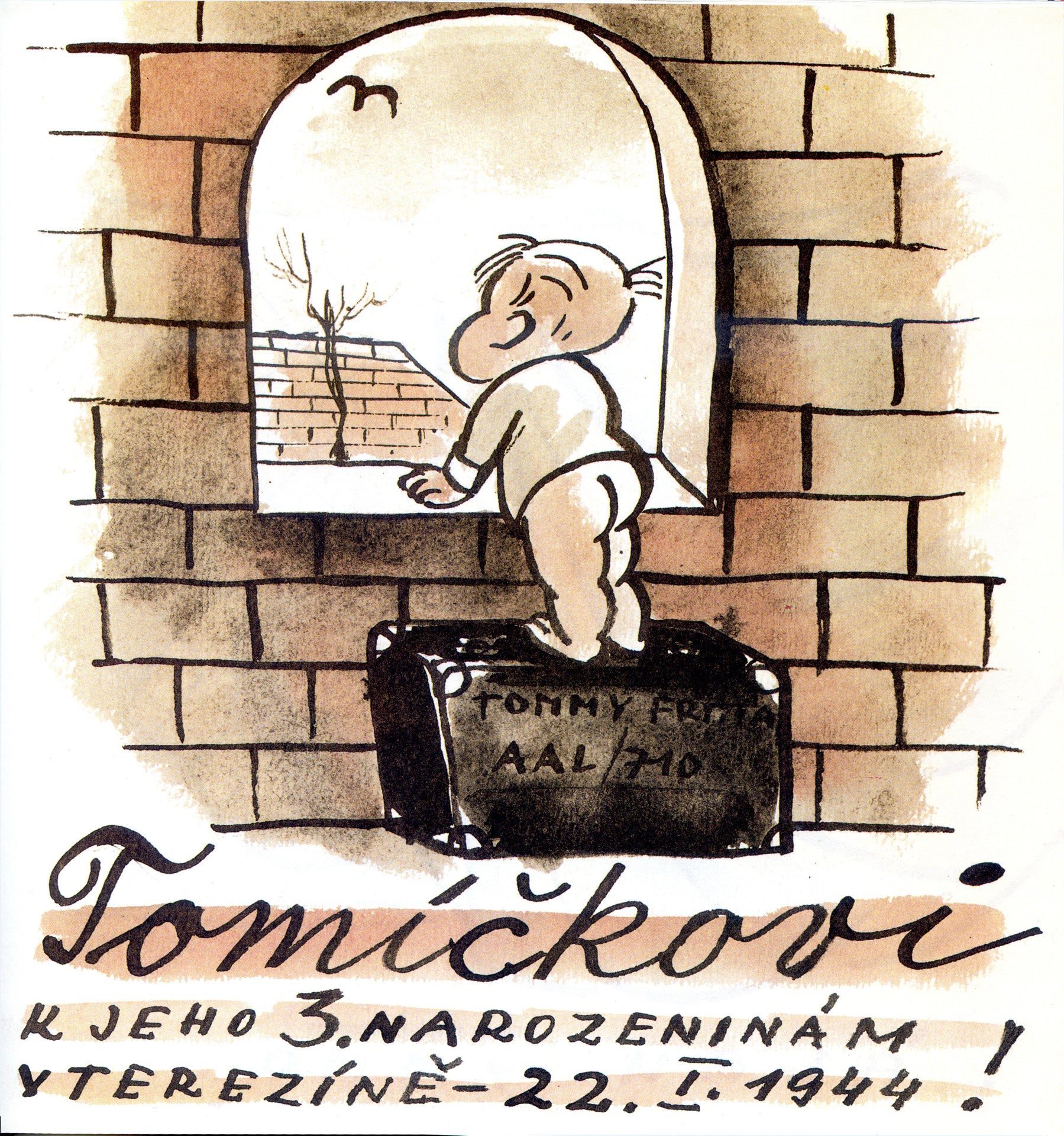 בדז'יך פריטה, צייר, מאייר וקריקטוריסט, הגיע בנובמבר 1941 לגטו טרזין ונתמנה למנהל המחלקה הטכנית שנתמכה בידי הגרמנים אשר הסתייעו באמנים להפצת התעמולה השקרית על הגטו לדוגמא. ואולם בהיחבא ציירו האמנים את המציאות האיומה. נוסף לציוריו המחתרתיים, הכין פריטה לבנו תומי אלבום, מתנה ליום הולדתו השלישי. זה לצד זה משמשים באלבום הצבעוניות העליזה עם סמלים ותכנים המלמדים על מציאות החיים בגטו.
